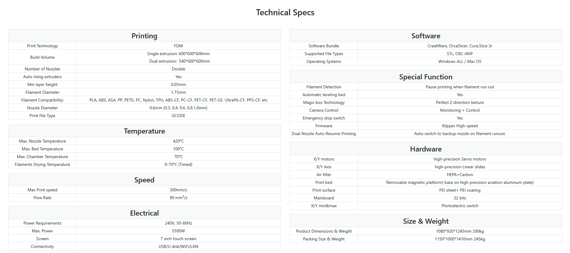 D600 Pro 2 ist mit einem neuen intelligenten, automatisch ansteigenden Dual-Extruder-Kit ausgestattet, das eine Temperatur von bis zu 420 ℃ erreicht. Es ist in der Lage, technische Materialien wie PLA, ABS, PC, UltraPA, Kohlefaser, Glasfaser u.a. mit schnell entfernbaren Trägermaterialien zu drucken.